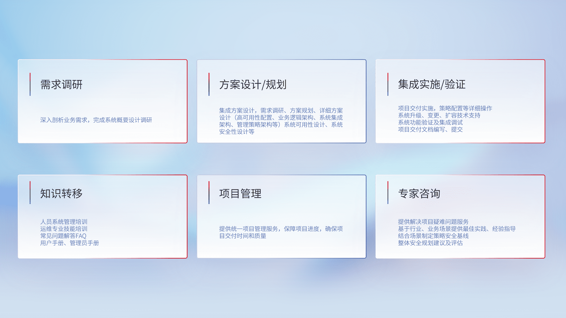 针对客户行业特性,,,,将宏观的安全战略和需求,,通过专业的交付服务,,,,实现项目落地,,为客户提供标准规范的集成交付服务。。。。